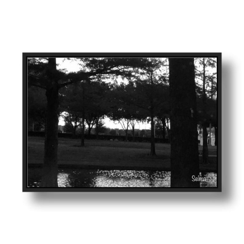 Get lost in the photographic art of this serene setting. The Search is minimalist black and white that brings out the reflective element of the water as the trees bounce in its mirror.
